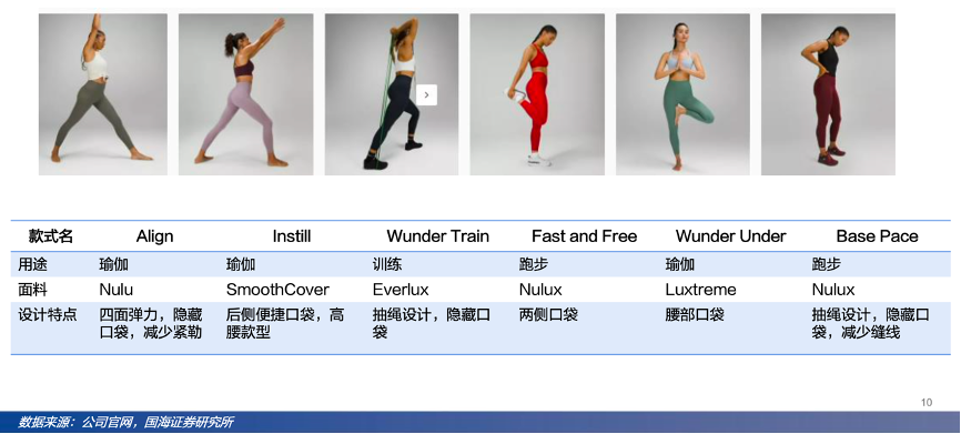 經(jīng)典案例:根據(jù)公司官網(wǎng)、國(guó)海證券研究所等綜合資訊表明,露露樂(lè)蒙公司以瑜伽褲聞名,而針對(duì)各個(gè)場(chǎng)景有分別對(duì)應(yīng)的明星產(chǎn)品。