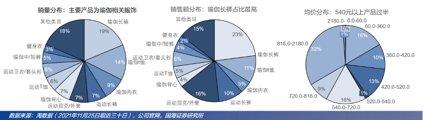 經(jīng)典案例:根據(jù)淘數(shù)據(jù)、公司官網(wǎng)、國(guó)海證券研究所等綜合資訊表明,露露樂(lè)蒙公司經(jīng)營(yíng)中高端運(yùn)動(dòng)產(chǎn)品,女士運(yùn)動(dòng)服飾涵蓋瑜伽、訓(xùn)練、出行和跑步等多種場(chǎng)景。從淘數(shù)據(jù)來(lái)看,天貓旗艦店540元以上產(chǎn)品占大多數(shù)。銷(xiāo)量分布顯示,從銷(xiāo)售額和銷(xiāo)售量對(duì)比來(lái)看,瑜伽長(zhǎng)褲、運(yùn)動(dòng)夾克/外套是當(dāng)中的高價(jià)產(chǎn)品。