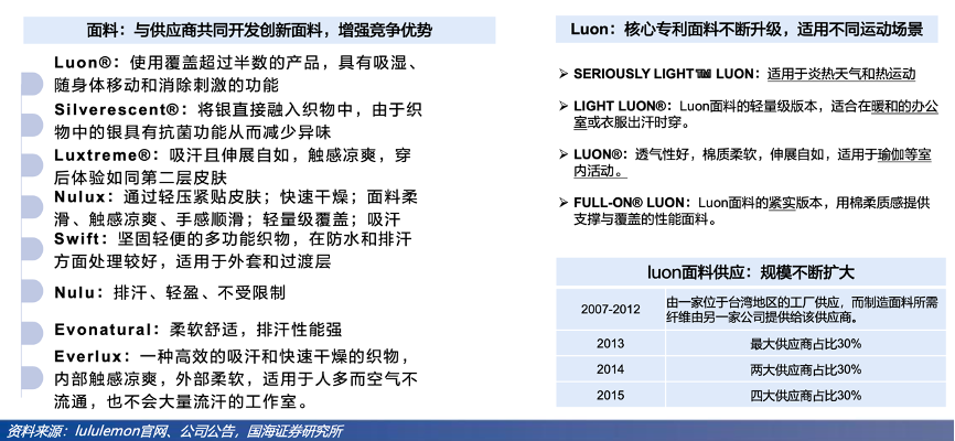 經(jīng)典案例:根據(jù)LuLuLemon官網(wǎng)、公司公告、國海證券研究所等綜合資訊表明,Lululemon以出色的面料聞名,Luon面料正是將Chip Wilson變成“King of Luon”的王牌面料,有一段時間75%的收入來自于該種面料制成的產(chǎn)品。