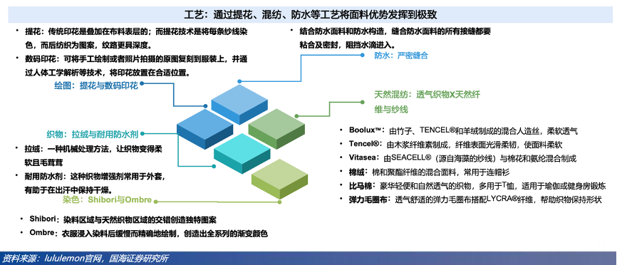 經(jīng)典案例:根據(jù)LuLuLemon官網(wǎng)、國海證券研究所等綜合資訊表明,Lululemon的設(shè)計理念是在最需要的關(guān)鍵部位提供完美支撐,而其他部位則自由無舒服,這樣的穿著感通過兩種不同構(gòu)造來打造,優(yōu)秀工藝突出。