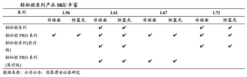 經(jīng)典案例:根據(jù)公司公告、國泰君安證券研究等綜合資訊表明,明月鏡片公司截至目前零售渠道共有 12 個 SKU,醫(yī)療渠道共有 8 個 SKU,公司在近視管理鏡片品類已有合計 20 個 SKU 同時在售,在產(chǎn)品線豐富度方面繼續(xù)保持明顯領(lǐng)先。