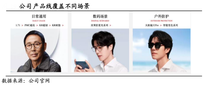 經(jīng)典案例:根據(jù)公司官網(wǎng)、國泰君安證券研究等綜合資訊表明,明月鏡片公司自主研發(fā)設(shè)計鏡片光學(xué)結(jié)構(gòu)、膜層結(jié)構(gòu),產(chǎn)品系列覆蓋滿足日常生活需求的通用型鏡片、針對不同人群及多元使用場景的功能性鏡片,如長時間使用電子屏幕人群可以選擇明月獨(dú)家雙重防藍(lán)光系列、喜歡透光性更強(qiáng)“水晶”般透亮不反光的可以選擇 PMC 超亮系列,追求輕薄鏡片體驗(yàn)人群可選擇折射率 1.71 系列以及適合戶外防護(hù)的近視太陽鏡片 Pro 系列,還有 KR 超韌、智能變色、漸進(jìn)多焦點(diǎn)等品類的鏡片。