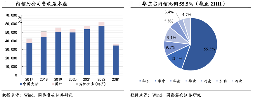 經(jīng)典案例:根據(jù)wind、國泰君安證券研究等綜合資訊表明,國內(nèi)市場(chǎng)消費(fèi)者基數(shù)大、市場(chǎng)培育成熟、下游需求穩(wěn)定,因此國內(nèi)業(yè)務(wù)是明月鏡片公司的基本盤,2020-2022 年國內(nèi)中國大陸地區(qū)收入占比 90%+。國內(nèi)市場(chǎng)分地區(qū)看,截至 21H1, 華東/華中/華南/華北地區(qū)收入占內(nèi)銷收入比例分別為 55.5%/12.4%/9.1%//9.1%,華東地區(qū)是主力市場(chǎng),內(nèi)銷收入份額超50%。