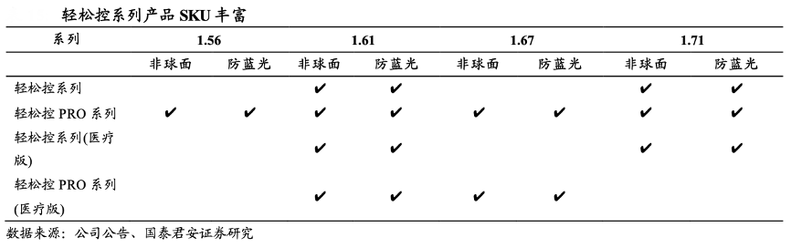 經(jīng)典案例:根據(jù)公司公告、國泰君安證券研究等綜合資訊表明,明月鏡片公司于 2022 年發(fā)布具有雙重防藍(lán)光功能的近視防控鏡片新產(chǎn)品,2023 年發(fā)布 1.56pro 和 1.56pro 防藍(lán)光。截至目前零售渠道共有 12 個(gè) SKU,醫(yī)療渠道共有 8 個(gè) SKU,公司在近視管理鏡片品類已有合計(jì) 20 個(gè) SKU 同時(shí)在售,在產(chǎn)品線豐富度方面繼續(xù)保持明顯領(lǐng)先。