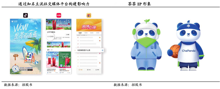 經(jīng)典案例:根據(jù)招股書、國泰君安證券研究等綜合資訊表明,茶百道數(shù)字化營銷、IP 營銷和品牌聯(lián)名建立強大的線上影響力。其通過品牌 IP“茶茶”提升品牌形象,設(shè)計并推出 “茶茶”表情包、“茶茶”特色創(chuàng)意商品,并與 KOL 及網(wǎng)紅進行合作。