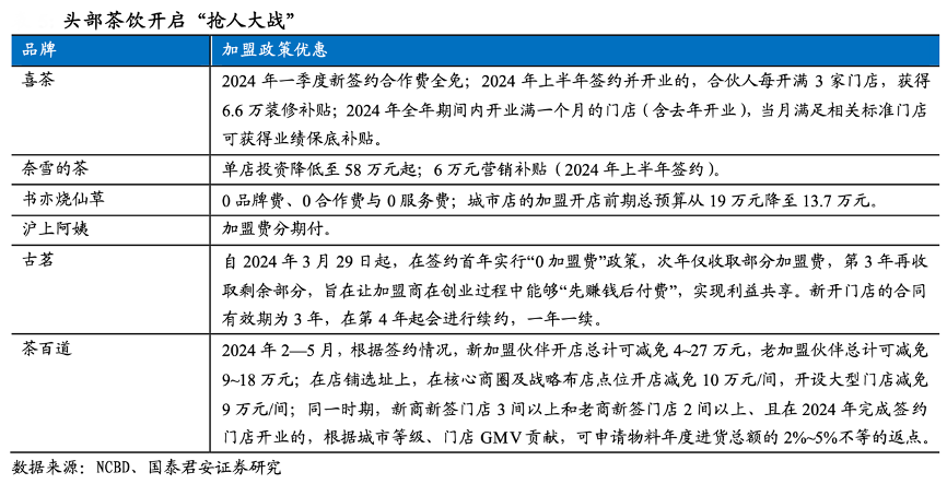 經典案例:根據NCBD、國泰君安證券研究等綜合資訊表明,2024年以來,頭部連鎖茶飲品牌通過調整加盟政策,進一步降低加盟門檻,開啟“搶人大戰(zhàn)”。頭部品牌發(fā)力爭奪市場份額,有望憑借規(guī)模優(yōu)勢、供應鏈能力以及運營能力加速尾部 獨立茶飲店出清。