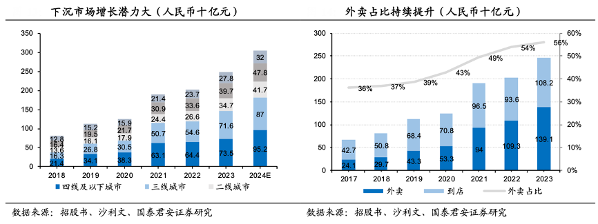 經典案例:根據招股書、沙利文、國泰君安證券研究等綜合資訊表明,隨著外賣平臺和應用程序的普及,尤其年輕人生活方式和用餐偏好的改變,茶飲外賣滲透率持續(xù)提升。國內現制茶飲店市場通過外賣實現的零售額 已由 2018 年的人民幣 297 億元增至 2023 年的人民幣 1391 億元,年復合增長率為 36.2%;2023 年,現制茶飲行業(yè)外賣滲透率達到 56.3%。