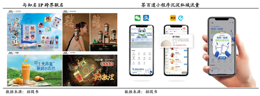 經(jīng)典案例:根據(jù)招股書、國泰君安證券研究等綜合資訊表明,茶百道數(shù)字化營銷、IP 營銷和品牌聯(lián)名建立強大的線上影響力。其通過微博、微信、小紅書、抖音、嗶哩嗶哩及快手等主流社交平臺獲客,通過抖音進行線上直播和品牌營銷吸引消費者,抖音直播團購獲得“穩(wěn)居全國帶貨團購榜”、“茶飲品類直播 GMV”、“品牌專場轉(zhuǎn)化率”等多個行業(yè)第一。同時通過品牌 IP“茶茶”提升品牌形象,設(shè)計并推出“茶茶”表情包、“茶茶”特色創(chuàng)意商品,并與 KOL 及網(wǎng)紅進行合作。
