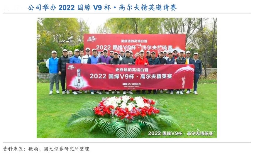經(jīng)典案例:根據(jù)微酒、國(guó)元證券研究所等綜合資訊表明,國(guó)緣定位高端,堅(jiān)持高舉高打。例如, 2022 年 8 月,國(guó)緣 V9 與國(guó)家高爾夫球隊(duì)結(jié)成合作伙伴, 同年 11 月舉辦“2022 國(guó)緣 V9 杯·高爾夫精英邀請(qǐng)賽”,吸引近 800 位精英人士參 與,在高端消費(fèi)者圈層展開精準(zhǔn)營(yíng)銷;更在 2023 年末的今世緣發(fā)展大會(huì)上,公司更是提出了“高端醬酒,獨(dú)愛國(guó)緣 V9”的鮮明 slogan,并簽約知名演員胡軍成為國(guó)緣 V9 代言人。