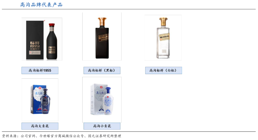 經(jīng)典案例:根據(jù)公司官網(wǎng)、今世緣官方商城微信公眾號(hào)、國(guó)元證券研究所等綜合資訊表明,高溝品牌2022年品牌重塑后,以新品標(biāo)樣開啟新征程。公司 2022 年 8 月推出高溝標(biāo)樣 新品,定位黃淮名酒帶高線光瓶典范,其中高溝標(biāo)樣 1955 是高端形象產(chǎn)品,黑標(biāo)、白標(biāo)為主銷品,兩者中又以黑標(biāo)為先。