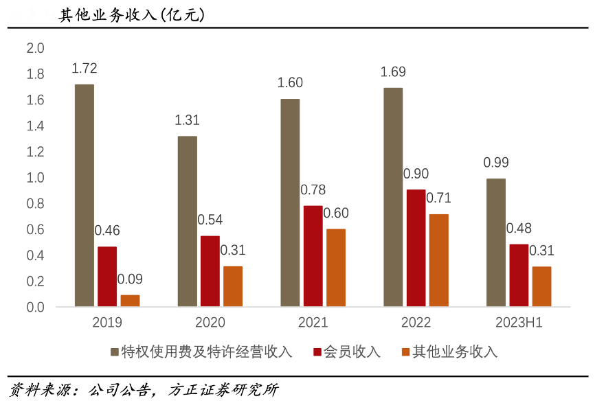經(jīng)典案例:根據(jù)公司公告、方正證券研究所等綜合資訊表明,百果園會員收入的占比逐年提高,特許權(quán)使用費及特性經(jīng)營收入逐漸恢復(fù)至疫情前水平。其會員收入主要指 18 年開始的“心享” 付費會員計劃,消費者可選擇 99 元的基本套餐或 199 元的升級套餐獲得優(yōu)惠券與會員折扣。
