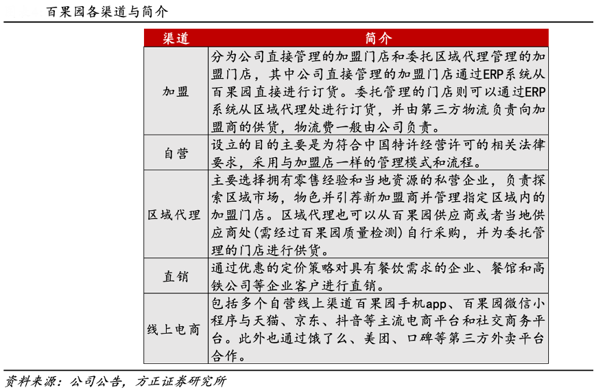經(jīng)典案例:根據(jù)公司公告、方正證券研究所等綜合資訊表明,百果園主要通過門店加盟業(yè)務(wù)擴張,同時部署“線上做寬線下做專”的業(yè)務(wù)模式。通過區(qū)域代理快速探索區(qū)域市場,占領(lǐng)市場份額。
