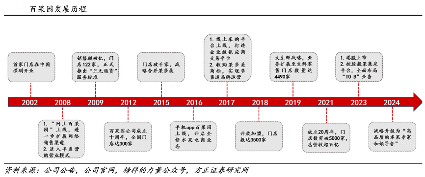 經(jīng)典案例:根據(jù)公司公告、公司官網(wǎng)、榜樣的力量公眾號(hào)、方正證券研究所等綜合資訊表明,百果園業(yè)務(wù)多元化發(fā)展,品牌戰(zhàn)略升級(jí)。2019 年發(fā)布“大生鮮” 戰(zhàn)略,2020年推出“熊貓大鮮”布局生鮮市場(chǎng)。2023 年公司于港股上市,并控股般果平臺(tái),全面布局“To B”業(yè)務(wù)。2024 年品牌戰(zhàn)略升級(jí)為“高品質(zhì)的水果專家和領(lǐng)導(dǎo)者”,計(jì)劃十年內(nèi)營(yíng)收達(dá)到千億級(jí)別。