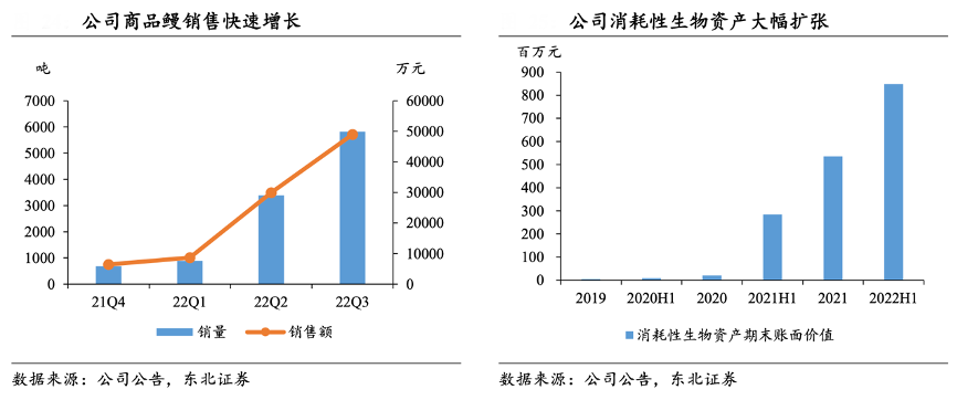 經(jīng)典案例:根據(jù)公司公告、東北證券等綜合資訊表明,2021年以來天馬科技公司鰻魚養(yǎng)殖規(guī)??焖贁U(kuò)張,當(dāng)期新增鰻魚銷售收入 6440 萬元,毛利率達(dá)到 48.1%。2022 年公司鰻魚養(yǎng)殖業(yè)務(wù)出 塘節(jié)奏加快,前三季度鰻魚銷量為 5819 噸,實現(xiàn)鰻魚收入 4.9 億元。截止 2022 年 上半年,公司消耗性生物資產(chǎn)已經(jīng)達(dá)到 8.5 億元。