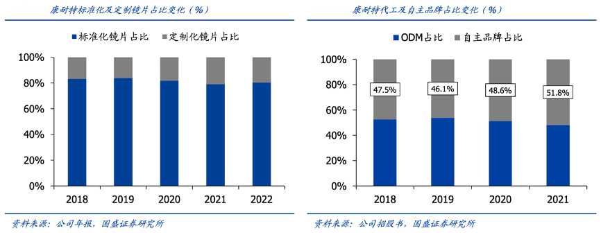 經(jīng)典案例:根據(jù)公司年報(bào)、公司招股書、國盛證券研究所等綜合資訊表明,定制化產(chǎn)品主要目標(biāo)是滿足個(gè)性化驗(yàn)光參數(shù)和功能需求,如通過染色或鍍膜給鏡片添加 偏光、變色、防藍(lán)光、防刮、抗反光及防污等功能。2018-2022年康耐特定制鏡片收入占比從 16.61%上升至 19.59%,短期內(nèi)定制鏡片訂單依舊以客戶自主填寫信息下單為主;同時(shí)高效率運(yùn)輸和物流等服務(wù)持續(xù)賦能,定制化能力突出。