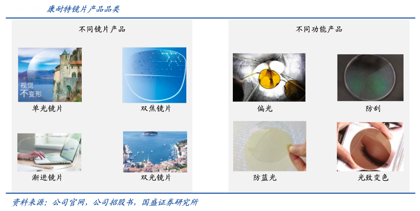 經(jīng)典案例:根據(jù)公司官網(wǎng)、公司招股書、國盛證券研究所等綜合資訊表明,康耐特產(chǎn)品矩陣豐富,定制化能力突出。自 2018 年日本開放專利以來,康耐特是目前唯一成功引進(jìn)日本 1.74 折射率鏡片生產(chǎn)技術(shù)并批量生產(chǎn)的公司。此 外,公司根據(jù)鏡片設(shè)計,將產(chǎn)品分為平光鏡片、單光鏡片、多焦點鏡片及漸進(jìn)鏡片,能夠覆蓋絕大多數(shù)標(biāo)準(zhǔn)鏡片設(shè)計,SKU 超 600 萬。