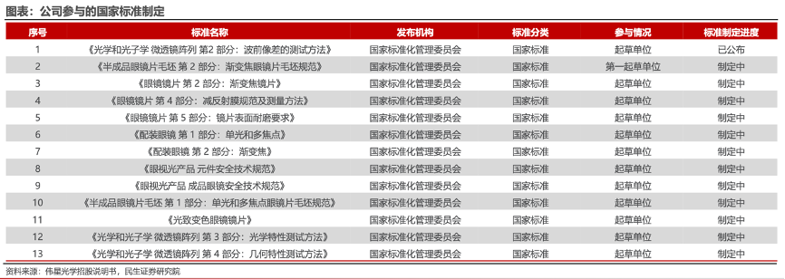 經(jīng)典案例:根據(jù)偉星光學(xué)招股說明書、民生證券研究院等綜合資訊表明,截至截至2023年6月30日,偉星光學(xué)公司累計(jì)作為起草單位參 與11項(xiàng)國家標(biāo)準(zhǔn)制定,其中《半成品眼鏡片毛坯第2部分:漸變焦眼鏡片毛坯規(guī)范》為公司主導(dǎo)項(xiàng)目。