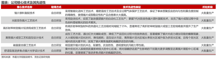 經(jīng)典案例:根據(jù)偉星光學(xué)招股說明書、民生證券研究院等綜合資訊表明,截至2022年底,偉星光學(xué)公司已形成包含六項(xiàng)核心技術(shù)的技術(shù)矩陣,打造了獨(dú)特的技術(shù)優(yōu)勢(shì),例如公司近百種樹脂鏡片原料復(fù)配方案實(shí)現(xiàn)快速高效響應(yīng)市場(chǎng)需求;光致變色鏡片工藝技術(shù)所制產(chǎn)品具有光致變色響應(yīng)速度快、色彩豐富、耐老化壽命長(zhǎng)、底色淺、變色程度深等特點(diǎn)。公司以六大核心技術(shù)為生產(chǎn)基礎(chǔ),通過核心技術(shù)的產(chǎn)業(yè)化應(yīng)用保證公司鏡片產(chǎn)品性能的優(yōu)越性以及質(zhì)量的穩(wěn)定性。