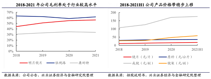 經(jīng)典案例:根據(jù)招股說(shuō)明書(shū)、公司公告、興業(yè)證券經(jīng)濟(jì)與金融研究院等綜合資訊表明,明月鏡片公司毛利率穩(wěn)步提升,主要原因有:1)產(chǎn)品結(jié)構(gòu)優(yōu)化(高折射率鏡片、功能片占比提高)疊加品牌影響力提升帶來(lái)產(chǎn)品價(jià)格帶上移;2)2019 年開(kāi)始,公司大力發(fā)展電商渠道銷售成鏡產(chǎn)品,隨著規(guī)模效應(yīng)的凸顯,成鏡產(chǎn)品單位成本持續(xù)下降。