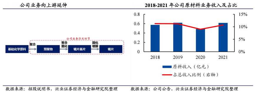 經(jīng)典案例:根據(jù)招股說(shuō)明書(shū)、公司公告、興業(yè)證券經(jīng)濟(jì)與金融研究院等綜合資訊表明,明月鏡片自主研發(fā)鏡片原料,打通產(chǎn)業(yè)鏈上游。2006 年,公司與韓國(guó) KOC 合作設(shè)立工廠江 蘇可奧熙,研發(fā)并生產(chǎn)樹(shù)脂原料。同時(shí)公司與研究機(jī)構(gòu)合作,掌握了實(shí)驗(yàn)室制備 1.67 和 1.71 折射率樹(shù)脂單體的配方和制備流程。2021 年公司原料業(yè)務(wù) 收入 0.62 億元,占比 10.69%。