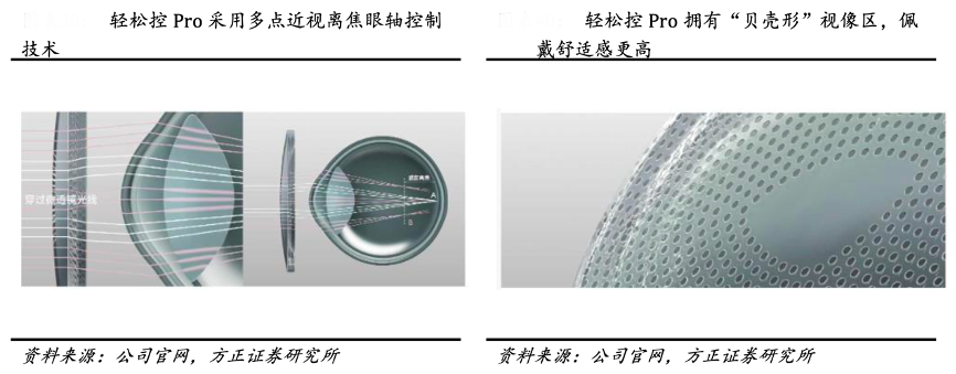 經(jīng)典案例:根據(jù)公司官網(wǎng)、方正證券研究所等綜合資訊表明,2021 年 12 月,明月鏡片公司推出“輕松控Pro”,產(chǎn)品采用多點近視離焦眼軸控制技術(shù),采用繁密的“滿天星”微透鏡排列,增加離焦面積,內(nèi)部雕刻高達 1295 個正度數(shù)微透鏡,使周邊區(qū)域成像落在視網(wǎng)膜前,從而形 成膜前離焦,進而起到控制眼軸過快增長的作用。輕松控 Pro 同時還 根據(jù)中國孩子“水平視野切換多、上下視野切換少”的用眼習(xí)慣,設(shè) 計出非對稱貝殼形視像區(qū),提升佩戴舒適感。