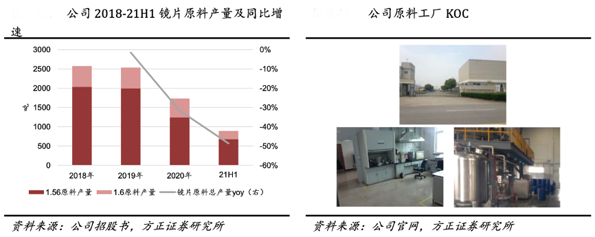 經(jīng)典案例:根據(jù)公司招股書、公司官網(wǎng)、方正證券研究所等綜合資訊表明,明月鏡片公司可自主生產(chǎn)折射率 1.56 及 1.60 系列的樹脂單體自用及對外銷 售,已掌握實驗室制備 1.67 及 1.71 折射率鏡片相關(guān)樹脂單體的配方和制備流程,考慮到 1.67 及 1.71 型號高折樹脂單體的生產(chǎn)條件要求嚴格,從經(jīng)濟性角度選擇采購而非自產(chǎn)。根據(jù)招股書披露,2018-21H1 公司鏡片原料總產(chǎn)能分別為 2527 噸、2536 噸、1733 噸、890 噸。
