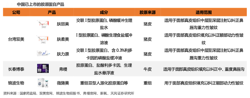 經(jīng)典案例:根據(jù)國(guó)家藥監(jiān)局、雙美官網(wǎng)、錦波生物招股書、弗縵官網(wǎng)、新氧、天風(fēng)證券研究所等綜合資訊表明,膠原醫(yī)美應(yīng)用目前仍以動(dòng)物源為主導(dǎo),重組膠原或可依賴技術(shù)突破加速滲透,頭部廠商爭(zhēng)相入局。此外,受膠原應(yīng)用廣泛性及發(fā)展前景吸引,錦波生物、巨子生物、愛美客、華熙生物、江蘇吳中等國(guó)內(nèi)頭部廠商均加速布局膠原蛋白醫(yī)美賽道。