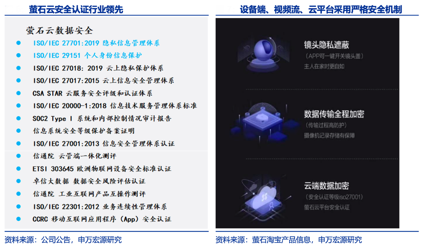 經(jīng)典案例:根據(jù)公司公告、螢石淘寶產(chǎn)品信息、申萬宏源研究等綜合資訊表明,螢石對云安全投入較高,2017年是業(yè)內(nèi)首家通過 ISO27001 安全認證的物聯(lián)網(wǎng)云平臺,2021年主動日均安全排查近 360 萬次,公司共拿到 15 項安全認證;同時,其自主研發(fā)云安全技術,提供自研輕量級安全傳輸方案和媒體鏈路安全傳輸方案。