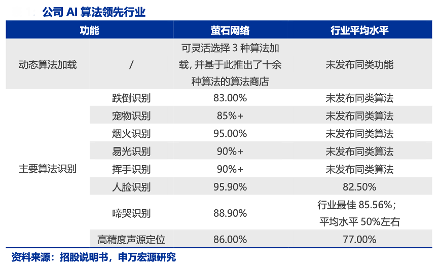 經(jīng)典案例:根據(jù)招股說明書、申萬宏源研究等綜合資訊表明,螢石公司打造算法商店,滿足兒童陪伴、老人看護、寵物陪護等智能家居場景下的剛性監(jiān)測需求。用戶可以根據(jù)應用場景的需要自主選擇 AI 算法,以快速定制家居或類家居場景的解決方案,公司在 AI 算法上領先行業(yè)平均水平。