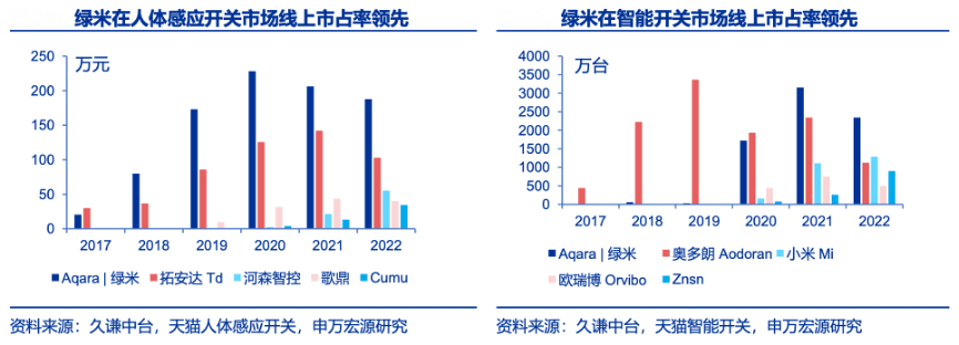 經(jīng)典案例:根據(jù)久謙中臺(tái)、天貓人體感應(yīng)開關(guān)、天貓智能開關(guān)、申萬(wàn)宏源研究等綜合資訊表明,綠米聯(lián)創(chuàng)于 2014 年進(jìn)入智能家居領(lǐng)域,專注 于低功耗創(chuàng)新型智能家居系統(tǒng)的研究與推廣,2016 年推出全屋智能理念品牌 Aqara。疊加毫米波雷達(dá),提升識(shí)別精度,人體智能感應(yīng)開關(guān)、智能開關(guān)、智能套系均在天貓渠道出貨量領(lǐng)先。2022 年 2 月,發(fā)布 Aqara 人體傳感器 P1,采用 Zigbee3.0 協(xié)議和自主低功耗傳感技術(shù),在響應(yīng)速度、人體移動(dòng)監(jiān)測(cè)、續(xù)航能力上進(jìn)一步升級(jí)。