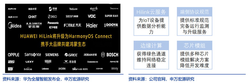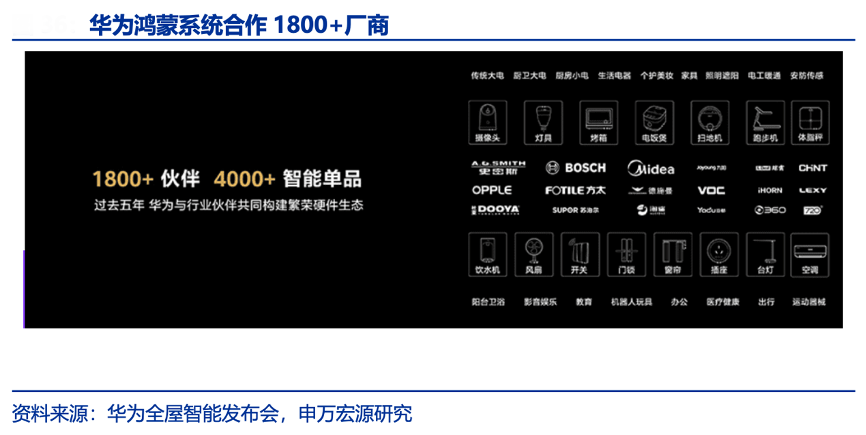 經(jīng)典案例:根據(jù)華為全屋智能發(fā)布會、申萬宏源研究等綜合資訊表明,作為硬件陣營的代表廠商,華為在鴻蒙系統(tǒng)、智能硬件方面具有突出優(yōu)勢,其智能設(shè)備則與其 他品牌合作接入,自身只提供電視等智能家居“入口”設(shè)備,相較小米等,底層控制能力更強,連接更為穩(wěn)定;SDK支持 20 多個品類,1200 多萬個設(shè)備,鴻蒙 OS 開源提供 17 個子系統(tǒng),134 個代碼倉庫。