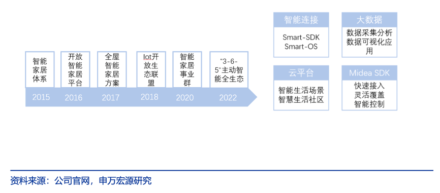 經(jīng)典案例:根據(jù)公司官網(wǎng)、申萬宏源研究等綜合資訊表明,在智能家居的布 局上,美的于 2014 年提出 M-Smart 概念,開始打造智能家居體系;2018 年推出 IoT 開 放生態(tài)聯(lián)盟;2020 年正式將智能家居事業(yè)群作為營收業(yè)務(wù)進(jìn)行統(tǒng)計,2021 年智能家居事 業(yè)群實(shí)現(xiàn)收入 2349 億元,同比增長 13%,占總營收比例超過 68%;2022 年推出“3-6-5 主動智能全生態(tài)”,逐鹿全屋智能解決方案。