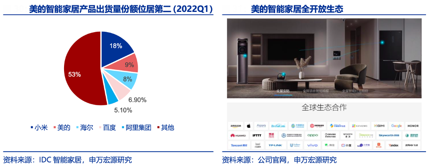 經(jīng)典案例:根據(jù)IDC智能家居、公司官網(wǎng)、申萬宏源研究等綜合資訊表明,美的概念始終走在前沿,2022 年推出的全屋智能解決方案引領(lǐng)行業(yè)向主動智能跨越;與華為合作搭載鴻蒙 OS 系統(tǒng),也為智能家居各陣營廠商未來的聯(lián)合方式提供了范例。同時,根據(jù) IDC 智能家居數(shù)據(jù),2022Q1 年美的智能家居產(chǎn)品出貨量占比 9.0%,僅次于小米,位居第二。