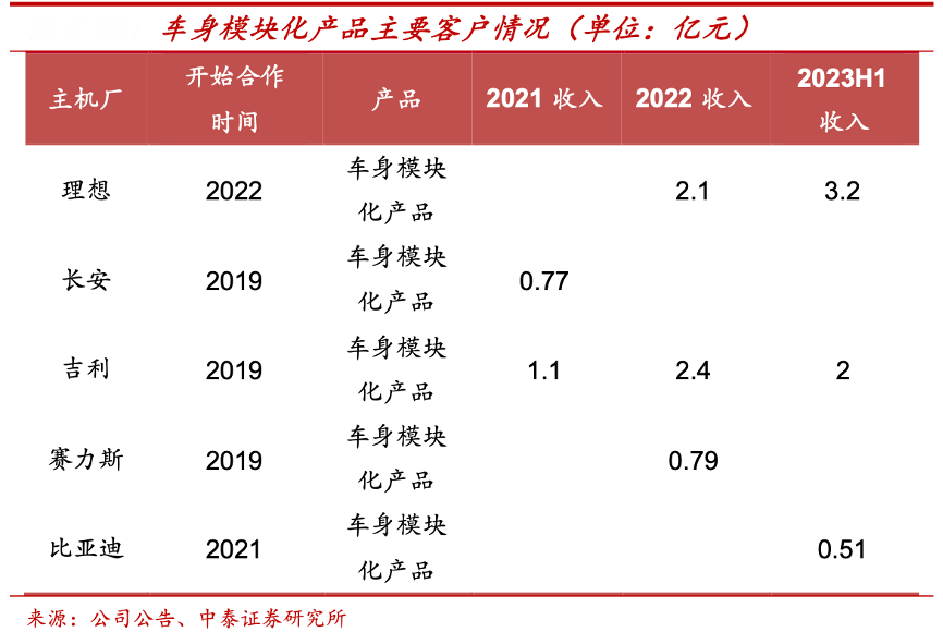 經(jīng)典案例:根據(jù)公司公告、中泰證券研究所等綜合資訊表明,博俊科技公司從 2018 年起積極拓展車身模塊化業(yè)務(wù),熟練掌握沖壓、熱成型、 焊接、激光焊接、注塑、裝配等工藝,并于 2019 年期借助車身模塊化產(chǎn)品升級(jí)為 Tier1,相繼與吉利、長安、賽力斯、比 亞迪、理想等頭部新勢力&自主建立合作。