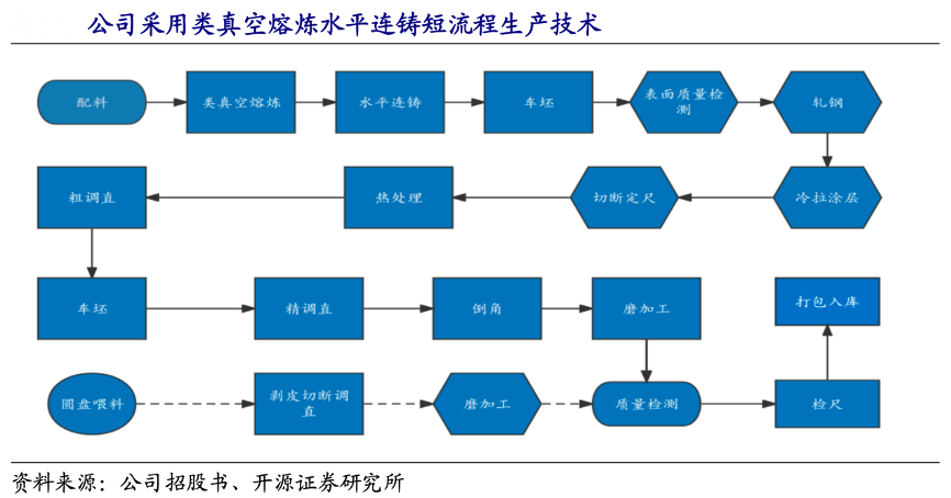 經(jīng)典案例:根據(jù)公司招股書、開源證券研究所等綜合資訊表明,金則利的核心產(chǎn)品通過采用類真空熔煉水平連鑄短流程生產(chǎn)技術(shù),替代了傳統(tǒng) 的真空熔煉方法,該生產(chǎn)工藝技術(shù)為國內(nèi)首創(chuàng)。其解決了鋼液二次氧化及鑄坯組織不均、致密度低等問題,同時優(yōu)化產(chǎn)品成分形成了小斷面連鑄耐蝕軟磁合金棒材技術(shù),打破了我國高端電磁閥用耐蝕軟磁合金大部分依賴進(jìn)口的局面。