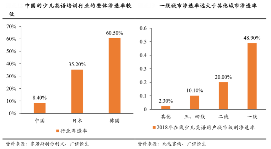 產(chǎn)業(yè)細化化、人群再開發(fā)成為在線少兒英語教育企業(yè)增長的巨大驅(qū)動力,下沉市場成為業(yè)績增長的“戰(zhàn)略增長地”。根據(jù)弗若斯特沙利文、比達咨詢、廣證恒生等綜合資訊表明,一線城市的滲透率整體接近 48.9%,預二線城市滲透率為 20.00%, 三、四線城市為 10.00%左右,整體增量市場空間較大。三四線城市及以下區(qū)域在線英語教育的增強。