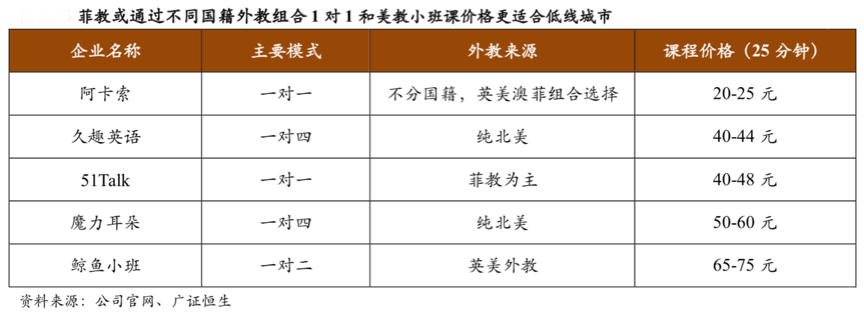 “下沉市場”在線英語教育市場再開發(fā),是企業(yè)業(yè)績再增長的一大動力,更是企業(yè)在線英語教育再發(fā)展的“戰(zhàn)略性舉措”。下沉市場拓展,創(chuàng)新經(jīng)營策劃是必要的,根據(jù)各公司官網(wǎng)、廣證恒生等綜合資訊表明,以菲教或通過不同國籍外教組合1對1和美教小班課價格更適合低線城市,其擁有強大的外教資源及小班教育優(yōu)勢,強化產(chǎn)品特色,提升產(chǎn)品的高效組合,強化外教高性價比資源組合,在線英語教育企業(yè)的下沉市場拓展,定可大有斬獲。