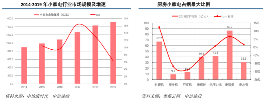 家電品類向小型化、品質(zhì)化及時尚化的發(fā)展趨勢日益明朗。根據(jù)中怡康時代、中信建投等綜合資訊表明,廚房小家電在國內(nèi)家電及小家電中的行業(yè)占比超過半數(shù),環(huán)境與個護類小家電市場份額相對較小,就細分品種來看,電飯煲、電壓力鍋等傳統(tǒng)成熟品類隨保有量及滲透率的提升,增速逐漸放緩趨平;豆?jié){機等品類受到破壁料理機等新興產(chǎn)品的替代沖擊,銷售額出現(xiàn)較大下降;破壁機等新 興品類維持高速增長態(tài)勢。