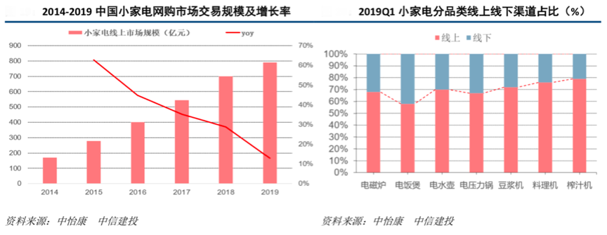 家電消費尤其是小家電消費如火如荼,以線上購買、在線咨詢交流等為代表的“網(wǎng)絡(luò)銷售”成為大家關(guān)注的核心,更成為小家電主力銷售場景之一。根據(jù)中怡康、中信建投等綜合資訊表明,小家電線上市場占據(jù)主導地位,主流品類線上銷售占比約為 65%-70%。伴隨國內(nèi)互聯(lián)網(wǎng)與電商的蓬勃發(fā)展,線上小家電市場發(fā)展迅速,2019 年小家電網(wǎng)購市場交易規(guī)模已接近 800 億元。奧維云網(wǎng) 2019Q1 數(shù)據(jù)顯示,榨汁機、料理機、豆?jié){機、電水壺四款產(chǎn)品線上銷售占比均 超 70%;電磁爐、電壓力鍋、電飯煲等烹飪產(chǎn)品線上占比也已超過 50%。