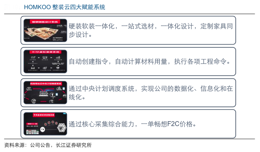 經(jīng)典案例:根據(jù)公司公告、長(zhǎng)江證券研究所等綜合資訊表明,“整裝云”是尚品宅配公司于 2017 年推出的新業(yè)務(wù)模式,旨在發(fā)展成為一個(gè)家裝產(chǎn)業(yè)鏈賦能型供應(yīng) 鏈平臺(tái)。HOMKOO 整裝云可利用圓方軟件的技術(shù)優(yōu)勢(shì),打通裝修全流程,研發(fā)出銷售設(shè)計(jì)、虛擬裝修、施工調(diào)度及供應(yīng)鏈管理等四大系統(tǒng),分別在全屋一體化設(shè)計(jì)、裝修清單、施工交付及 F2C 采購(gòu)等多個(gè)環(huán)節(jié)賦能中小裝企。