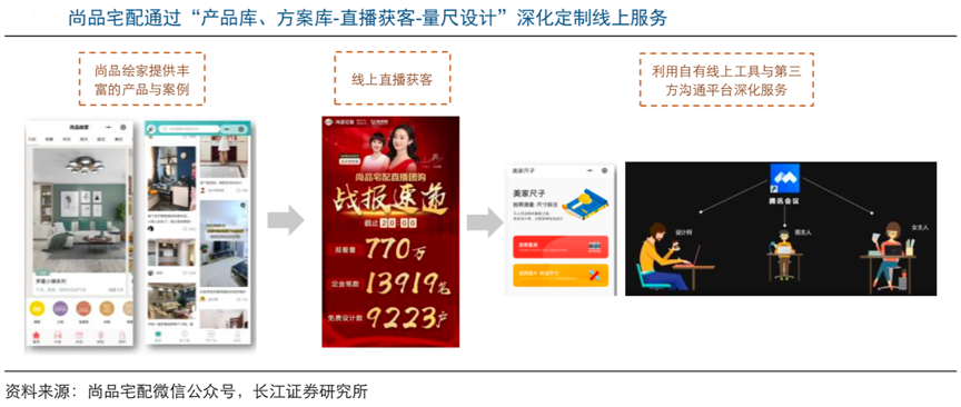 經(jīng)典案例:根據(jù)尚品宅配微信公眾號(hào)、長(zhǎng)江證券研究所等綜合資訊表明,家居服務(wù)環(huán)節(jié)多,此前家居線上僅為引流渠道,量尺、設(shè)計(jì)、安裝等服務(wù)主要依靠線下完成。而在疫情影響的倒逼下,尚品宅配推出了美家尺子、尚品繪家等線 上服務(wù)工具,使得在線即可完成如初次量尺、方案設(shè)計(jì)等環(huán)節(jié)。一是節(jié)省了客戶與員工的時(shí)間,二是可提升線上客戶的轉(zhuǎn)化率。