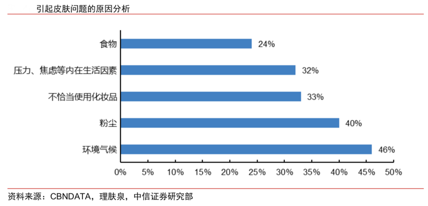 經典案例:根據(jù)CBNDATA、理膚泉、中信證券研究部等綜合資訊表明,外部環(huán)境、內在生活因素、不恰當使用化妝品等均會加劇皮膚問題。據(jù) CBNDATA 統(tǒng) 計,46%皮膚問題由氣候環(huán)境造成,40%由粉塵造成,33%由不恰當使用化妝品瓶造成, 32%由壓力、焦慮等內在生活因素造成,24%由食物造成。