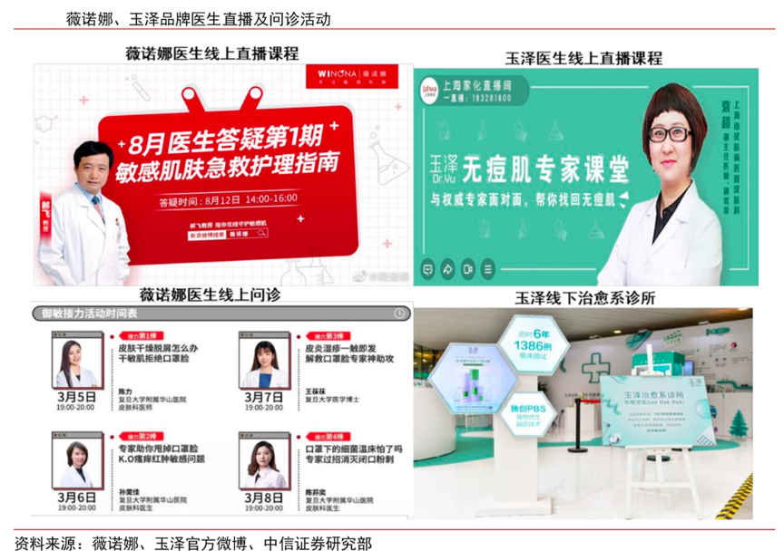 經典案例:根據(jù)薇諾娜、玉澤官方微博、中信證券研究部等綜合資訊表明,貝泰妮推進“醫(yī)研共創(chuàng)”,以專業(yè)型KOL 種草+線下體驗,增加消費者信任,增強粘性。除網(wǎng)紅KOL外,玉澤、薇諾娜均會邀請專業(yè)醫(yī)生進行線上直播,讓消費者更加了解自身皮膚問題及產品解決皮膚問題的原理;結合線下問診體驗,進一步挖掘消費者需求。