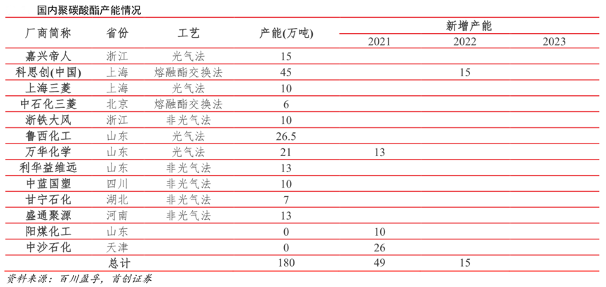 經(jīng)典案例:根據(jù)百川盈孚、首創(chuàng)證券等綜合資訊表明,截止至 2020 年底,我國(guó)的聚碳酸酯行業(yè)共有 11 家生產(chǎn)企業(yè),主要分布在科思創(chuàng) (中國(guó))、嘉興帝人、上海三菱、中石化三菱等外資獨(dú)資及中外合資企業(yè)手中,四家企業(yè)產(chǎn)能合計(jì) 76 萬噸,占比達(dá)到 42%。另據(jù)百川盈孚統(tǒng)計(jì),未來三年,國(guó)內(nèi)新增產(chǎn)能達(dá) 64 萬噸。魯西化工是國(guó)內(nèi)最早實(shí)現(xiàn)聚碳酸酯進(jìn)口替代的企業(yè)之一,近幾年擴(kuò)產(chǎn)迅速。