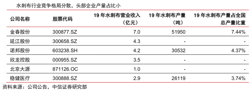 經(jīng)典案例:根據(jù)公司公告、中信證券研究部等綜合資訊表明,水刺布市場相對(duì)無紡布整體更加集中,但仍是分散市場。根據(jù)幾家披露產(chǎn)量的無紡布 企業(yè),金春股份/諾邦股份/穩(wěn)健醫(yī)療 2019 年產(chǎn)量分別占全國水刺布產(chǎn)量的7.44%/4.37%/3.74%,三家合計(jì) 15.55%,同時(shí)結(jié)合延江股份、欣龍控股的水刺布收入水 平,相對(duì)無紡布行業(yè)整體的集中度更高,其需要點(diǎn)亮產(chǎn)業(yè)新價(jià)值要素。