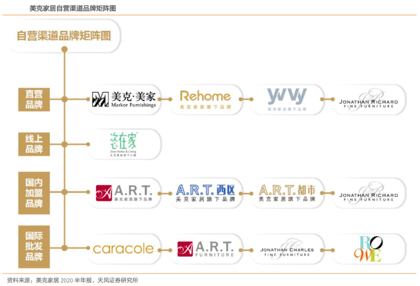 經(jīng)典案例:根據(jù)美克家居2020年半年報(bào)、天風(fēng)證券研究所等綜合資訊表明,美克家居公司通過多種渠道組合完成對旗下品牌的生產(chǎn)和營銷,以觸及更廣泛的消費(fèi)者。其目前直營品牌主要是美克美家、Rehome、YVVY;國際品牌在國內(nèi)通過加盟方式營銷的有 A.R.T.、 A.R.T.西區(qū)、A.R.T.都市以及 Jonathan Richard(Jonathan Charles 母品牌);國際批發(fā)品牌包括 caracole、A.R.T.、Jonathan Charles、ROWE;線上品牌為恣在家 Zest Home。