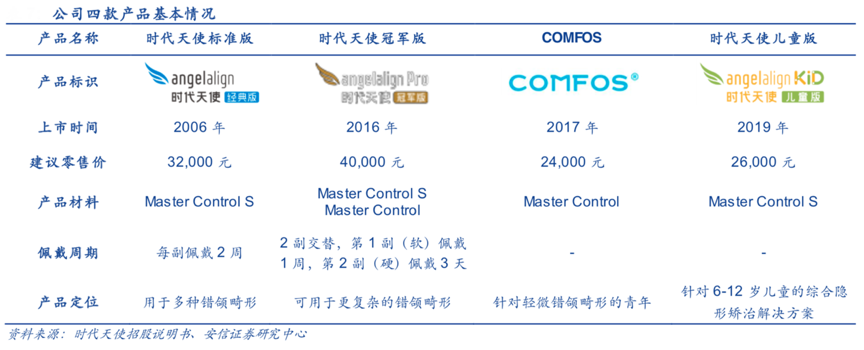 經(jīng)典案例:根據(jù)時代天使招股說明書、安信證券研究中心等綜合資訊表明,時代天使公司產(chǎn)品管線豐富,自2006 年推出首款隱形矯治器時代天使標(biāo)準(zhǔn)版后,又分別于 2016 年推出時代天使冠軍版,2017 年 推出COMFOS,2019 年推出時代天使兒童版,旨在形成全面的產(chǎn)品組合。