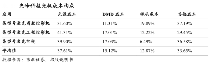 經(jīng)典案例:根據(jù)東北證券、招股說明書等綜合資訊表明,光峰科技公司需要對外采購日本日亞生產(chǎn)的藍(lán)光激光器、TI 生產(chǎn)的 DMD 芯片和日本理光生產(chǎn)的超短焦鏡頭,并與公司自主制造的熒光模組組裝成為激光顯示整機(jī)所需的光機(jī),并作為核心器件提供給產(chǎn)業(yè)應(yīng)用,用于各類激光顯示應(yīng)用領(lǐng)域。從光機(jī)產(chǎn)品來看,光源成本占比最高在30-40%之間,DMD 成本占比在15-20%,鏡頭成本占比約12%左右。