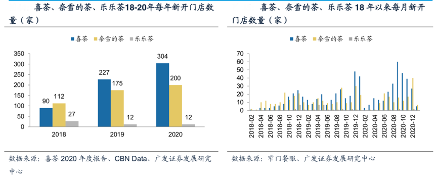 經(jīng)典案例:根據(jù)喜茶2020年度報(bào)告、CBN Data、窄門(mén)餐眼、廣發(fā)證券發(fā)展研究中心等綜合資訊表明,在經(jīng)歷了2015-17年新式茶飲消費(fèi)者教育的階段后,喜茶和奈雪的茶迅速完成品牌認(rèn)知和忠誠(chéng)度的積累,在資本助力下開(kāi)啟了快速開(kāi)店的階段,2018年-20年喜茶新開(kāi)門(mén)店90 家、227家、304家,截止21年1月,奈雪的茶在全國(guó) 共有513家門(mén)店。