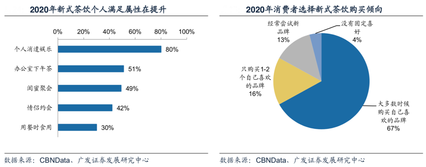經(jīng)典案例:根據(jù)CBNData、廣發(fā)證券發(fā)展研究中心等綜合資訊表明,根據(jù)大眾點(diǎn)評(píng)2019年數(shù)據(jù),在不同餐飲品類(lèi)中,飲品店點(diǎn)評(píng)熱度僅次于火鍋。根據(jù)CBNData,2020年消費(fèi)者偏好的消費(fèi)場(chǎng)景中,個(gè)人消遣娛樂(lè)達(dá)到 80%,茶飲的個(gè)人消費(fèi)屬性有所強(qiáng)化。此外下午茶、閨蜜聚會(huì)、情侶約會(huì)、用餐也是茶飲消費(fèi)的主要場(chǎng)景。消費(fèi)者對(duì)品牌忠誠(chéng)度在不斷提升,2020年大多數(shù)時(shí)候購(gòu)買(mǎi) 自己喜歡的品牌的消費(fèi)者占67%,只購(gòu)買(mǎi)自己喜歡的1-2個(gè)品牌的消費(fèi)者占16%。